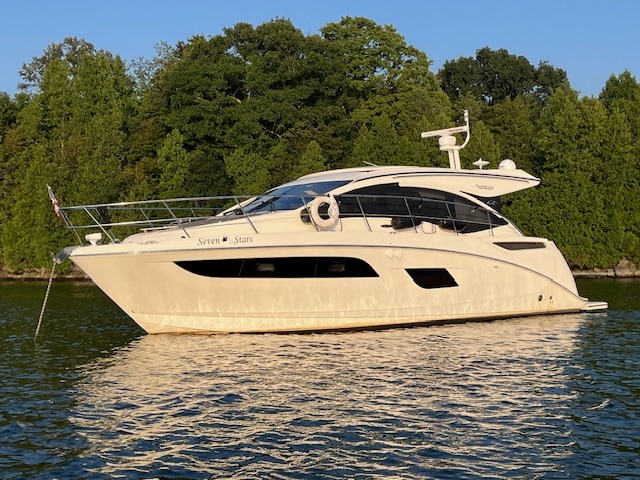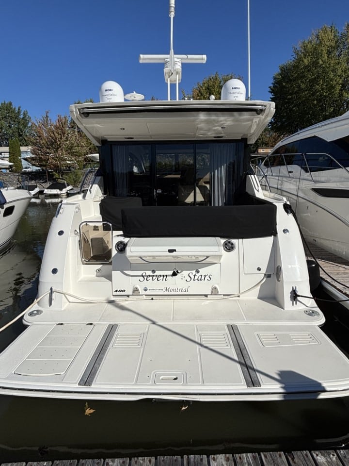 Loaded with options : Satellite TV, inverter, sureshade, bow-thruster, joystick control, aft gourmet station with Kenyon grill, hydraulic platform, and more.